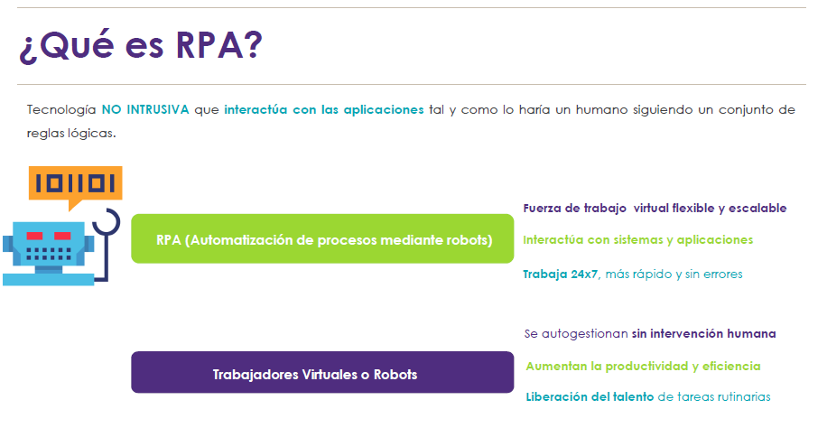 El RPA automatiza los procesos, sin cambiarlos, mediante la implementación de bots para recopilar datos estructurados y luego completar formularios o software. Debido a que RPA aprovecha los datos y procesos existentes, en general se puede implementar rápidamente dentro de una organización o departamento, y a bajo costo.